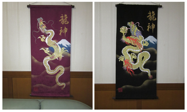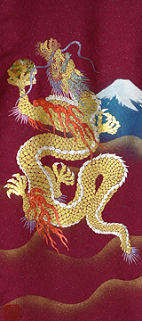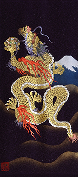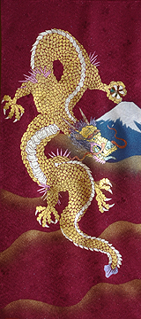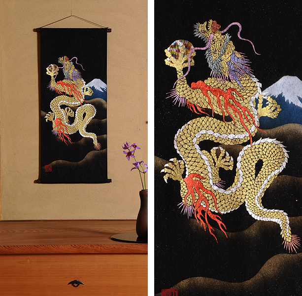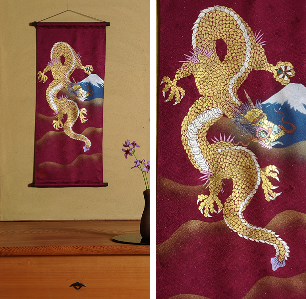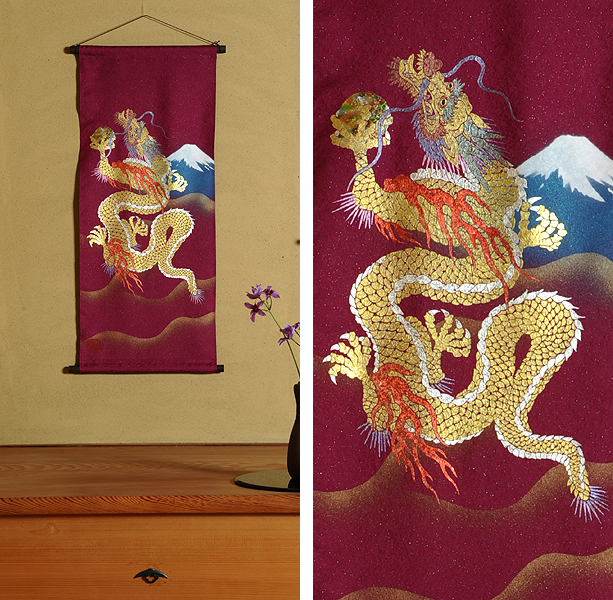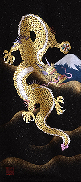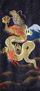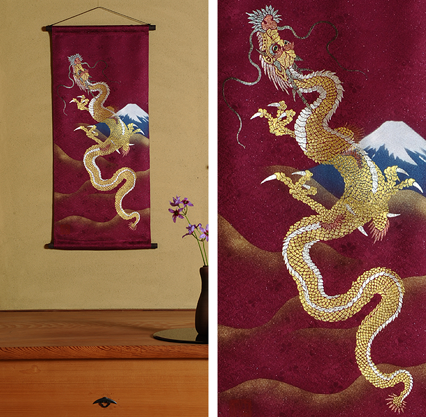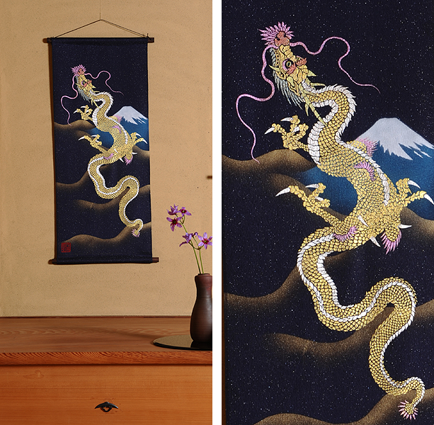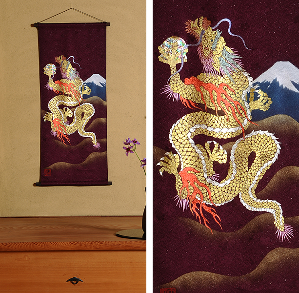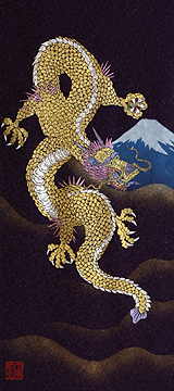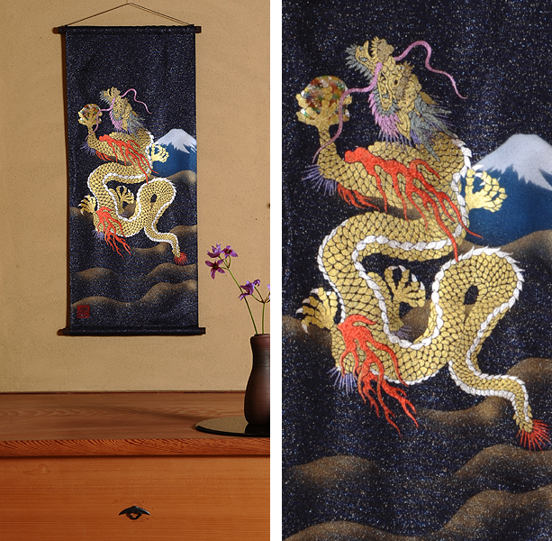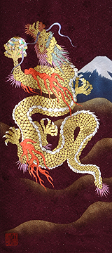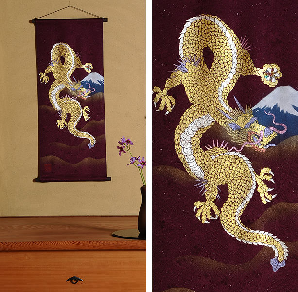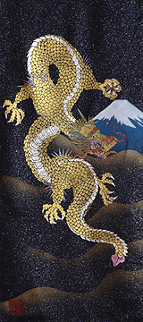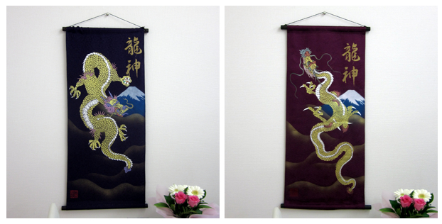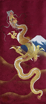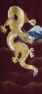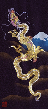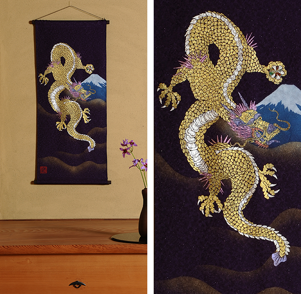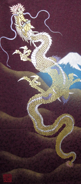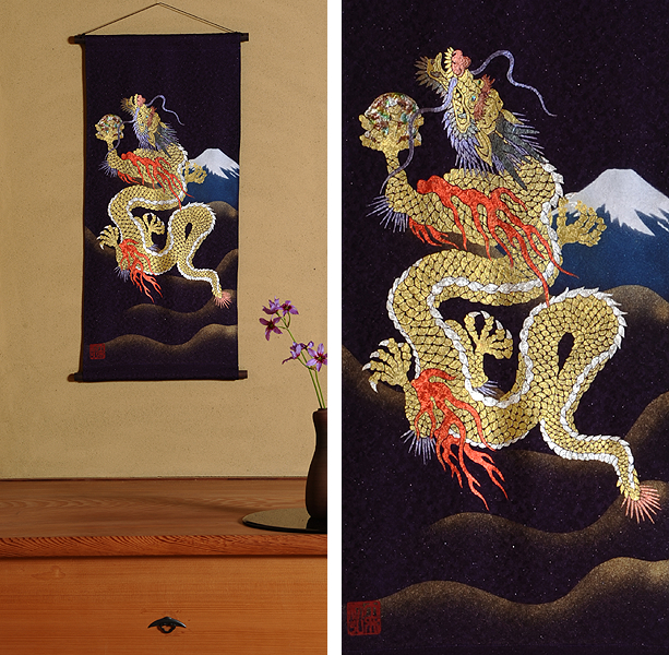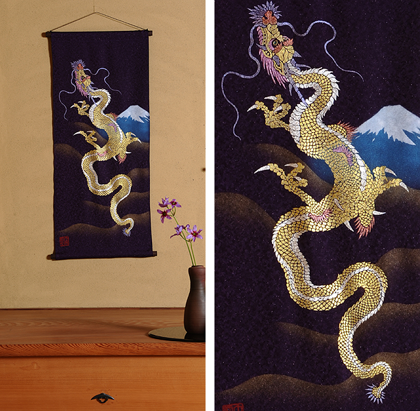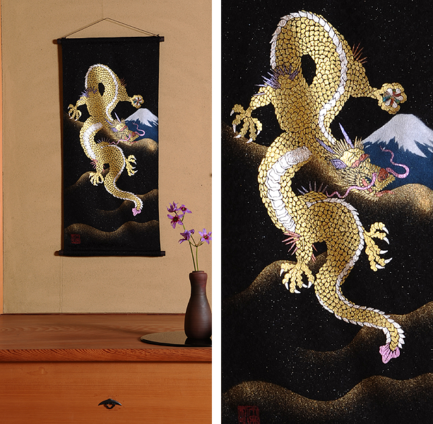 | 当工房では「昇り龍」「長寿龍」「飛炎龍」の3タイプのデザインで24金箔をはじめプラチナ箔・銀箔・色金箔・螺鈿を ふんだんに取り入れ、着物加工業で培った技術で他では無い独特の「黄金(24金)の龍神」オリジナルタペストリーを創作・販売しております。 生地はもちろん丹後産の銀糸通しの最高級品です。 地色は黒色・紺色・エンジ色・青紫・赤紫の5配色でご用意いたしました。 和室はもちろん洋室・リビング・オフィスにもにも違和感無く飾っていただくデザインです。 ※画像をクリックすると拡大します。
